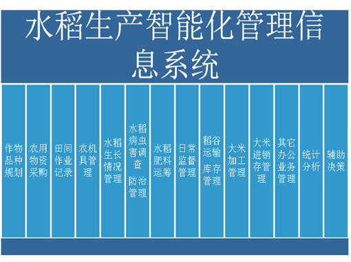 管理水稻生产全过程,涉及产前(种子、农资、机具)管理、产中(生长环境、水肥、病虫害防治)管理、产后(加工、仓储、运输、销售)管理,同时也具备智能分析决策功能。